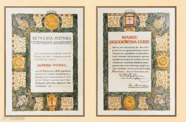 居里夫人第二次获奖、1911年的化学奖证书。四平八稳的精美装饰,也有书本、天平等等相关的符号。