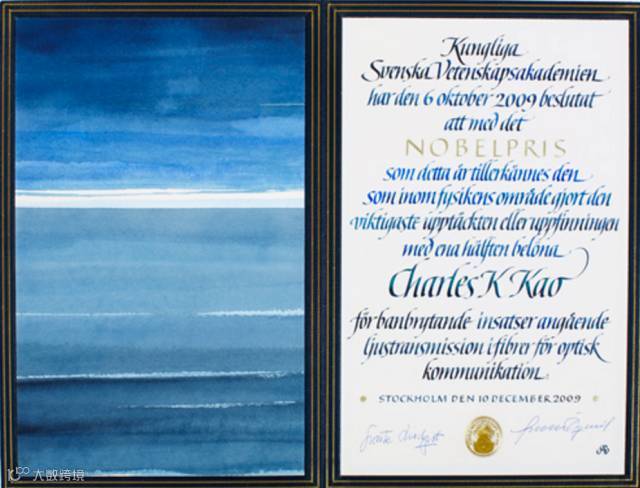 高锟,光纤通讯之父,2009年因为 “在光传输于纤维的光学通信领域突破性成就” 获诺贝尔物理学奖。他的证书非常简单,左边的画来自艺术家Sture Berglund,画的是瑞典和芬兰之间的波地尼亚湾的静谧和单调……不知道有没有和“海底光缆”相联系,或者说,光纤给单调的世界也送去了信息?