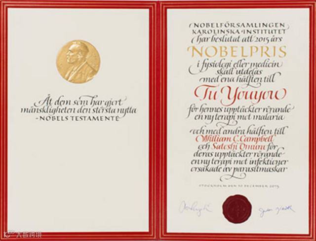 当然,也有不太走心的……并不是每个获奖者都有艺术家来画画,比如中国第一个诺贝尔科学奖得主屠呦呦的证书就只请了Calligrapher写字。(共享奖项的William C. Campbell和Satoshi Ōmura,证书上也都只有诺贝尔头像而已。)