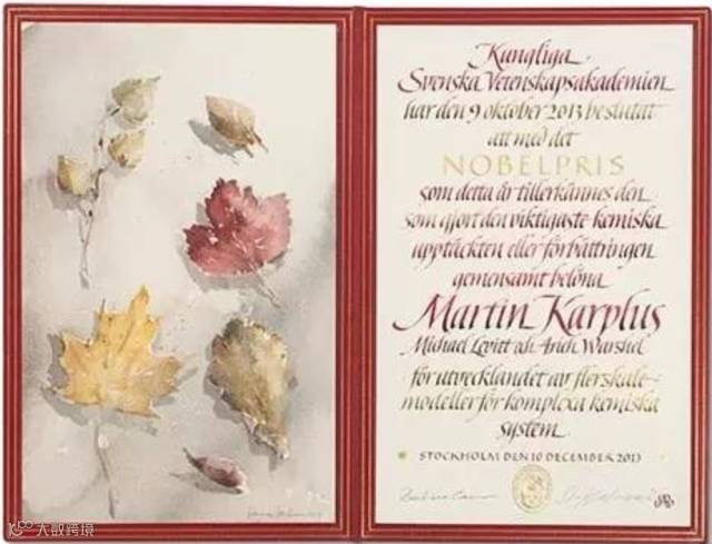 这个叫Hasse Karlsson的水彩画家也画了2013年的化学奖,马丁·卡尔普拉斯(Martin Karplus)因为“为复杂化学系统创造了多尺度模型”而获奖。大概是用不同大小的树叶表示“尺度”吧。
