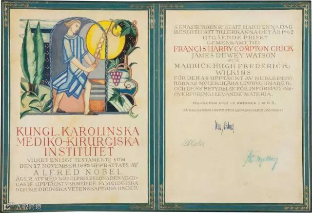这是1962年生理学/医学奖得住弗朗西斯·克里克的证书。克里克是发现DNA结构的二人之一,DNA是生命的螺旋,画上的这个人,手中也拿着一个发出光亮的好像是螺旋的东西,不过结构似乎没搞对?这个证书和当年的奖章一起,都被拍卖掉,用于支持Francis Cricks Institute的科学研究了。