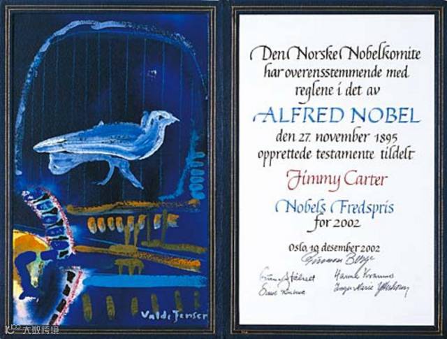另一个获奖的美国总统吉米·卡特的证书,很抽象地画了一个和平鸽在中间。卡特促成了美国和苏联的裁军,当时和平鸽也成为了culture icon。