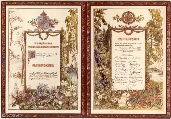 因为发现了自体免疫、细胞吞噬作用而获奖的保罗·埃尔利希(Paul Ehrlich)的证书。很漂亮、生机盎然的自然环境。