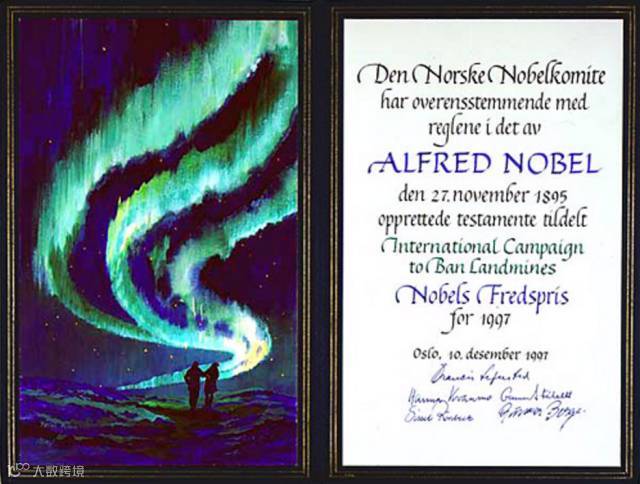 这是1997年颁给国际反地雷组织的和平奖。封面是漫天的极光照耀大地。反而是诺贝尔的名字很大。