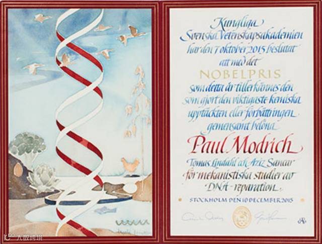 ▲ 这是2015年共享化学奖的三位获奖人的证书之一,获奖研究是有关DNA修复的工具。