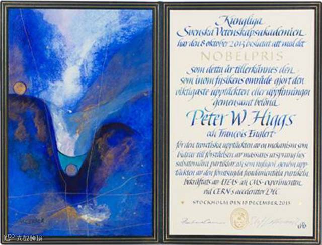 2013年物理学奖彼得·希格斯(Peter Higgs)的证书。“希格玻色子”大家可能都听说过,是标准模型里的基本粒子,证书里面的深邃的蓝色隐喻宇宙,而那颗仿佛有质量的粒子正坠进深空。