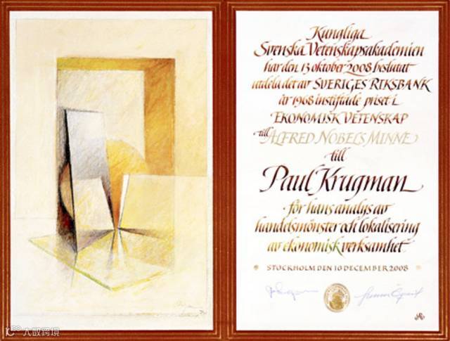 2008年的经济学奖保罗·克鲁格曼的证书。他的获奖理由是对国际经济活动的贸易模式和区域的分析,几何和镜面可能隐喻了“模型”。