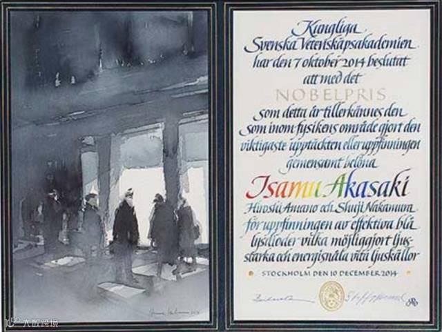 2014年因为蓝色发光LED而获得物理奖的赤崎勇的证书,名字被用彩色表示,而画里面则是蓝灰色的水彩、以及街道一旁明亮的橱窗——蓝色LED带来了节能的、明亮的光源。