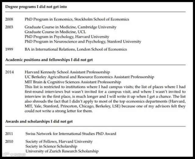 普林斯顿大学心理与公共事务助理教授强尼斯‧豪斯佛(Johannes Haushofer),在Twitter上列出一张自己的失败简历,洋洋洒洒写出: