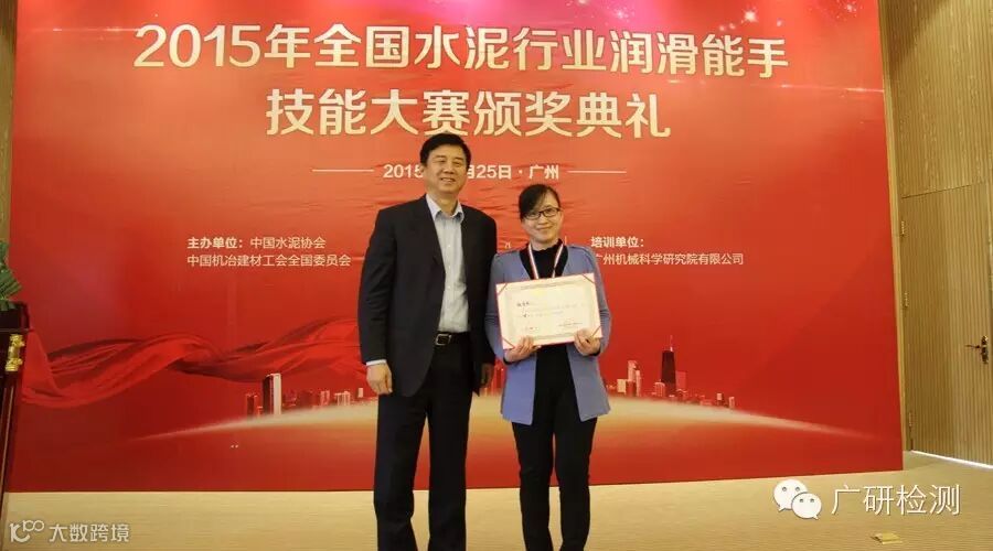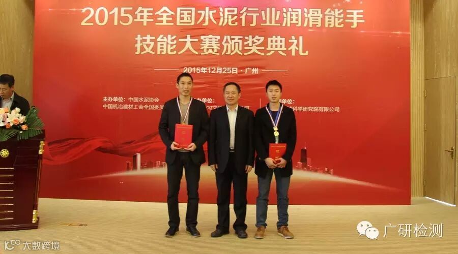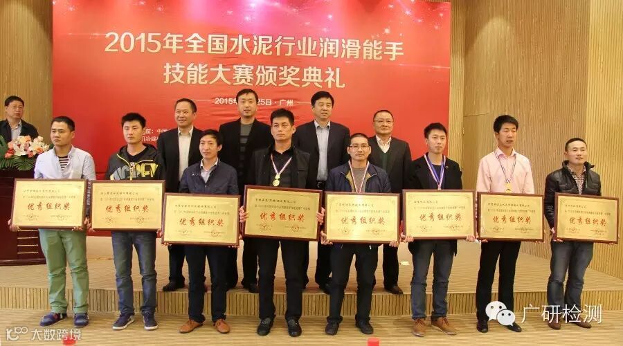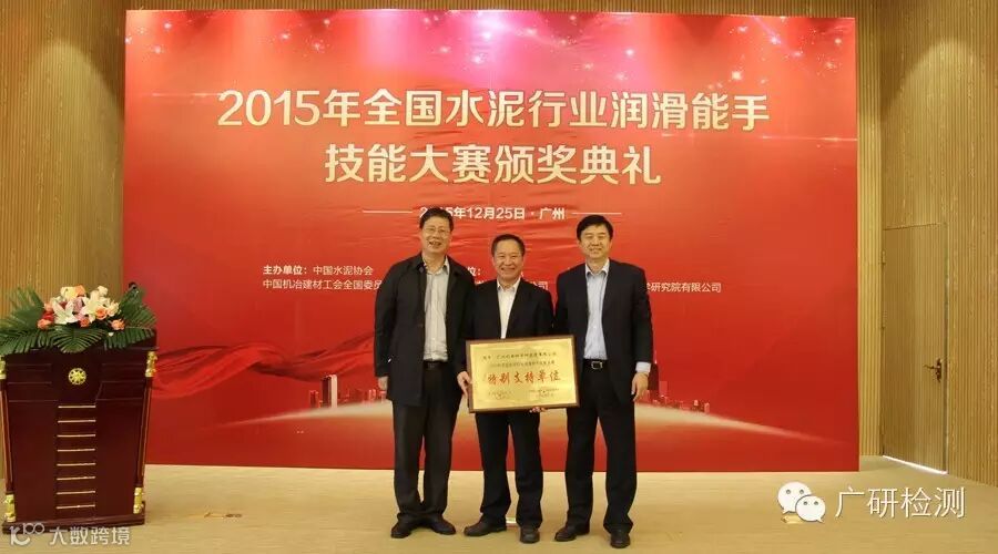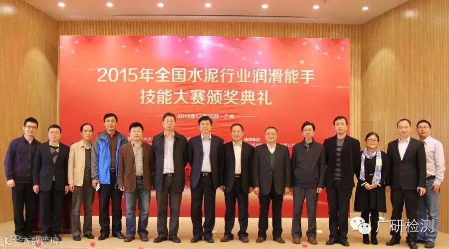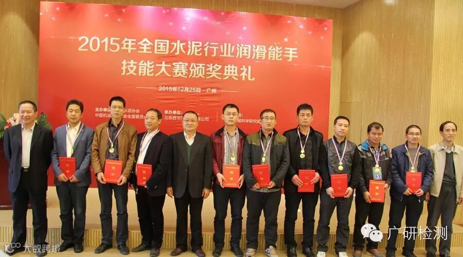 2015年12月25日下午,2015年全国水泥行业润滑能手技能大赛颁奖典礼在广州科学城维也纳酒店圆满举行,来自全国各大水泥行业100多名代表出席颁奖典礼。本次大赛由中国水泥协会和中国机冶建材工会全国委员会联合主办,广研检测承办,是我国水泥行业首届规模最大影响最广泛的润滑技能大赛。会议由中国水泥协会王郁涛副秘书长主持,中国水泥协会常务副会长兼秘书长孔祥忠先生、中国机冶建材工会全国委员毛凯先生、广东省水泥行业协会常务副会长李黎先生、广州机械科学研究院有限公司总经理助理贺石中先生等领导致辞。