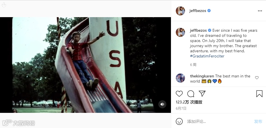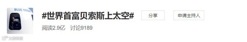 ئامازوننىڭ قۇرغۇچىسى جېف بېسوس دۇنيادىكى ئەڭ باي كىشىلەرنىڭ بىرى ھېسابلىنىدۇ، ئۇ بېيجىڭ ۋاقتى 20-ئىيۇل كەچ سائەت 9دا، كۆك رەڭ مەنبە شىركىتىنىڭ يېڭى شېپاد راكېتاسىغا ئولتۇرۇپ ئالەم كېمىسى ئالەم بوشلۇقىغا چىقىپ، ھاياتىدىكى تۇنجى قېتىملىق ئالەم سەپىرىنى ئىشقا ئاشۇردى.