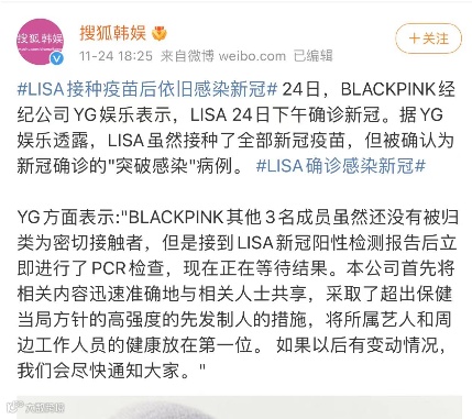 شۇ يەر ۋاقتى 24-نويابىر، كورېيە تاراتقۇلىرىنىڭ خەۋىرىگە قارىغاندا، BLACKPINK گۇرۇپپىسى ئەزاسى Lisa يېڭى تىپلىق تاجسىمان ئۆپكە ياللۇغى بىلەن يۇقۇملانغان دەپ دىياگنوز قويولغان.