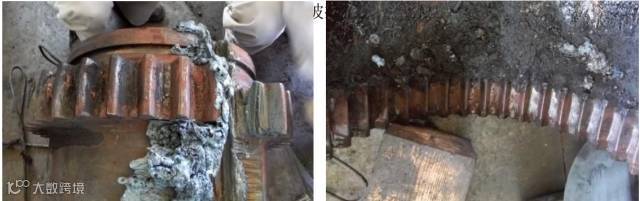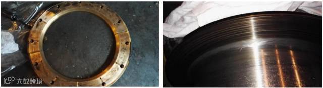 5月27日,利用大定修机械更换G4上下辊的齿接手,发现下辊马达侧的齿接手严重润滑不良,内齿在接触面上已被外齿磨损嵌入,且联轴器与轴咬死无法拆卸,后气割拆卸。下辊的止推瓦已被撞出轻微裂纹。