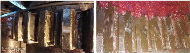 7月18日定修检查G4上辊电机联轴器,该联轴器虽然在5月27日上机使用不到3个月,但检查发现齿面已经严重磨损,内、外齿啮合面出现胶合状态,联轴器润滑脂只覆盖到了齿根部,齿面高度上无润滑。见图3。同时盘车打表再次测量了电机对中数据,未有明显异常。