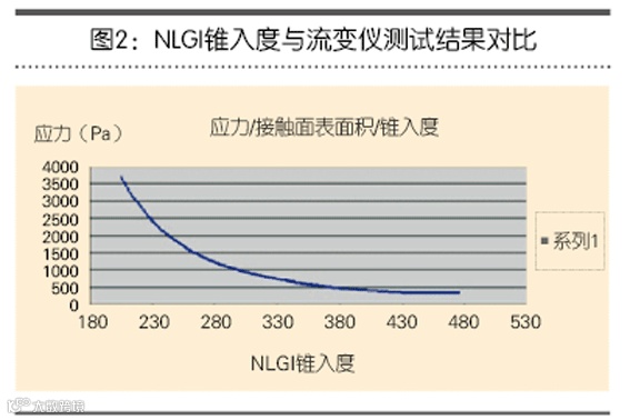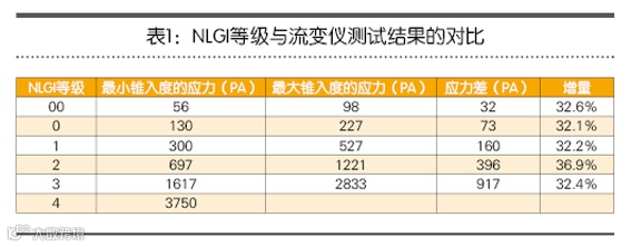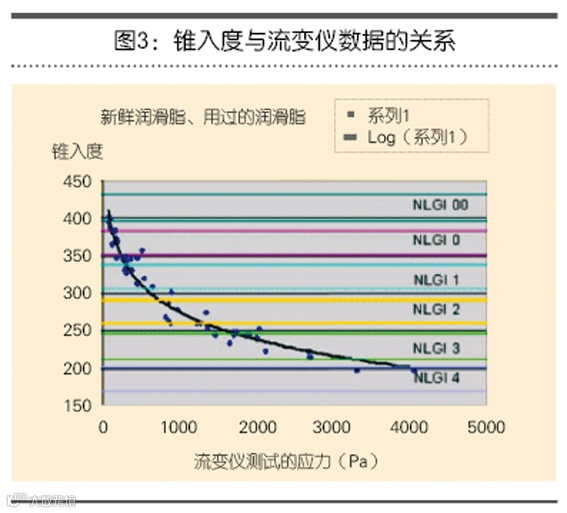 根据流变仪输出的数据,图3清楚地显示了NLGI稠度等级的非线性特质。图2显示了两种测试方法的结果及联系。表1显示了各种NLGI等级润滑脂的应力数据。要注意的是,润滑脂的稠度越高,其稠度等级下的稠度误差越大。