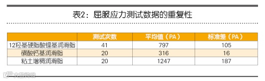 为了确定仪器和测试次序的重复次数,测试需要3种润滑脂,每种润滑脂进行多次试验。同种润滑脂装在一个容器中。测试的润滑脂种类包括12羟基硬脂酸锂基润滑脂、磺酸钙基润滑脂、粘土增稠润滑脂等等。测试结果如表2所示。