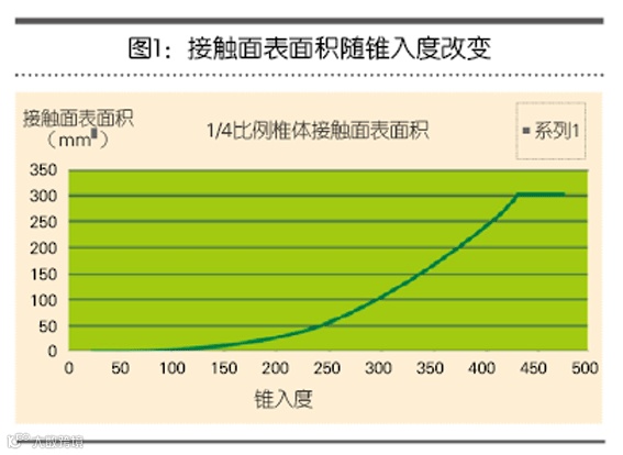 图1显示,润滑脂的锥入度增加,椎体与润滑脂的接触面表面积也发生改变。图中标示了锥入度,方便比较。如图所示,随着锥入度增加,椎体与润滑脂的接触面表面积变化曲线是非线性的。