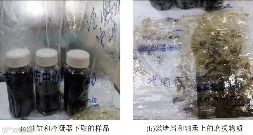 为了查明故障原因,客户送来三瓶空压机油样品和两个磨屑样品。三个油中有两瓶是从空压机油缸中取的样品,另一瓶是从冷凝器下面取得,如下图1(a)。两个磨屑样品分别取自空压机油缸下放油口和轴承,如下图1(b)。客户希望通过油液分析来找到冷凝器下油的来源,并通过磨粒形态分析来判断磨损的类型以及导致轴承磨损可能的原因。