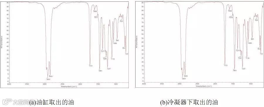 由表2的检测数据及红外光谱可知,这两种油的组份含量是一致,为同一种油。