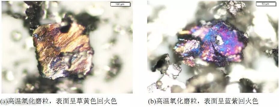 (2)空压机放油口磨屑(图4)尺寸较大,表面有擦伤痕迹,并且部分磨粒呈现蓝色或蓝紫色或火色,表明这些磨粒受到高温的影响;