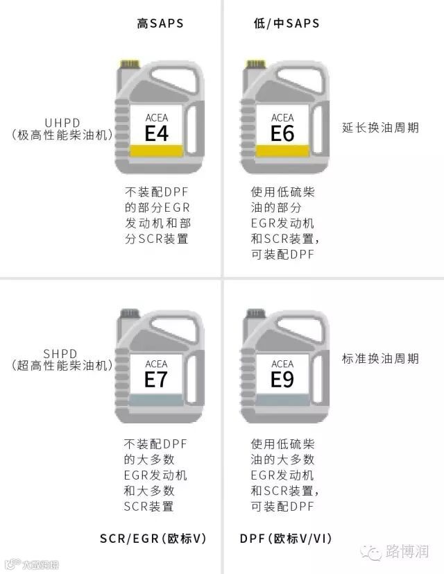 当今重型柴油发动机油的最低标准是ACEA E7,适用于未安装颗粒捕捉器的发动机。