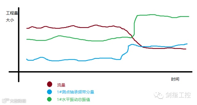 大致意思就是,在某一时刻,水泵的流量降低了,当降低到某一值后,1#测点的总振值和轴承频带分量均发生了较大幅度增长。
