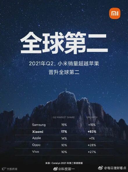 8-ئاينىڭ 10-كۈنى كەچتە، شياۋمى گۇرۇھىنىڭ باش مۇدىرى قوشۇمچە CEOسى لېي جۈن 2021-يىللىق نۇتقىدا، شياۋمىنىڭ يېقىنقى مەزگىلدىكى خۇش خەۋىرىنى ئېلان قىلدى، 2021-يىلى 2-پەسىلدە، شياۋمىنىڭ دۇنيا بويىچە يانفون سېتىلىش مىقدارى ئالمىدىن ئېشىپ، تۇنجى قېتىم دۇنيا بويىچە 2-ئورۇندا تۇرغان؛ شۇنىڭ بىلەن بىر ۋاقىتتا شياۋمىنىڭ سېتىلىش مىقدارى ياۋروپادا تۇنجى قېتىم ئۆرلەپ، سامسۇڭ ۋە ئالمىدىن ئېشىپ كەتكەن.