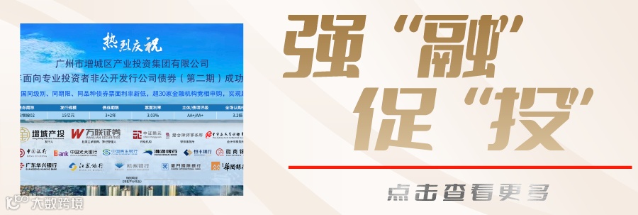 增城产投集团2023年在深交所成功发行两期公司债券,发行规模总计20亿元,第二期债券期限3+2年,票面利率3.03%,创2023年以来全国AA+主体同期限同品种债券票面利率新低。