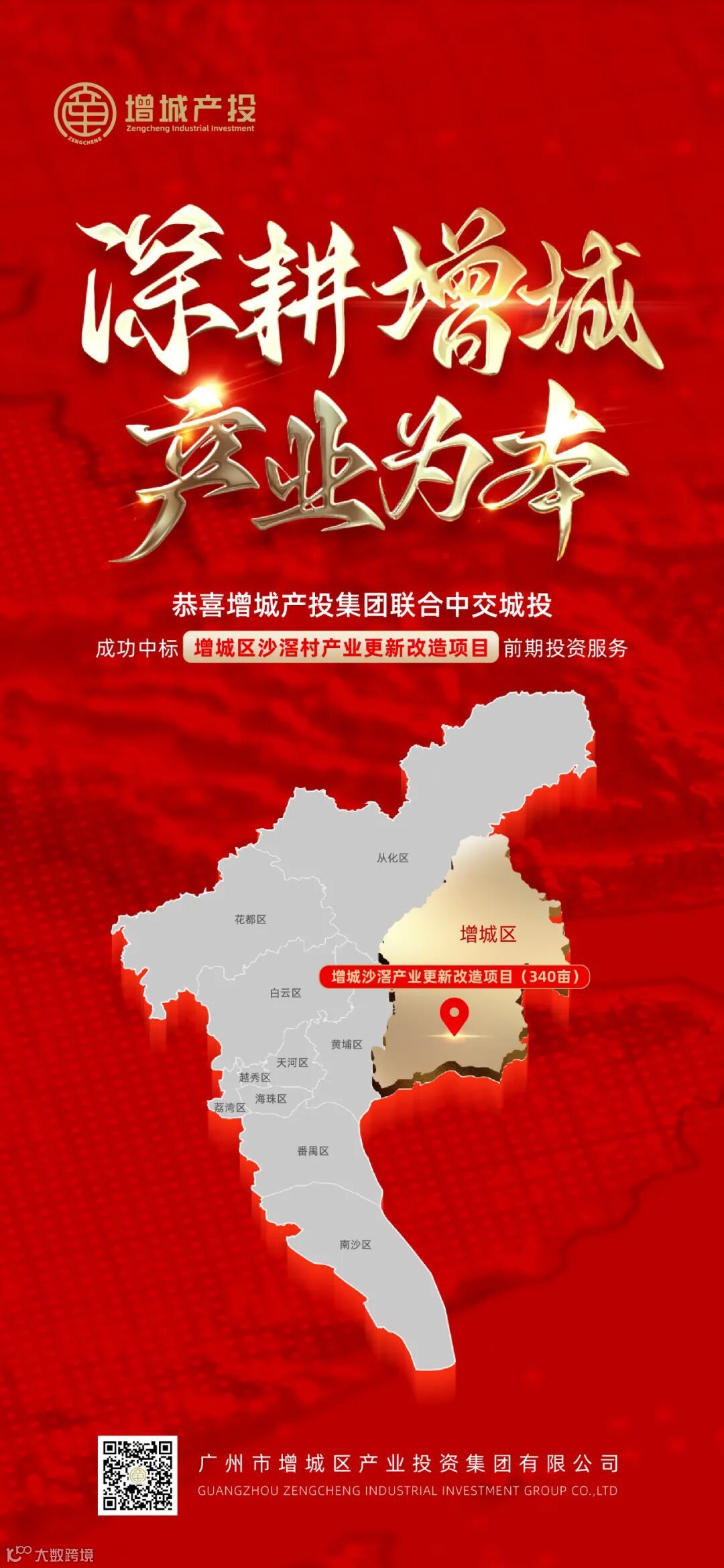 2023年4月28日,增城产投集团全资下属企业东进产业园公司联合中交城市投资控股有限公司,参与并成功中标沙滘村村镇工业集聚区更新改造项目前期投资服务。