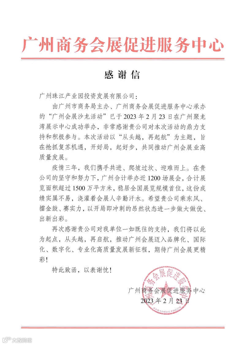 广州商务会展促进服务中心感谢信