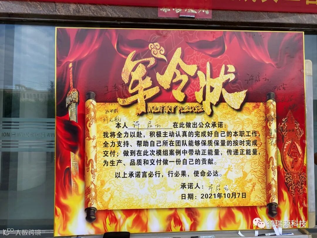 广东德瑞源新材料科技有限公司,2021年10月7日星期四早上7:30分许,公司全体人员参与了本次誓师大会,见证了模组专案骨干人才签订了军令状,在誓师大会启动的那一刻,模组专案为期一个月交付目标的号角已经正式吹响。