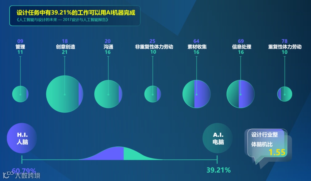 麦肯锡全球研究所(MGI)关于技术对未来工作影响的研究,估计出人们在全球经济中所从事的有偿活动中,几乎每个职业都有部分自动化的潜力,大约60%的职业至少有30%的活动在技术上可以自动化。同济x特赞设计与人工智能实验室范凌的《人工智能与设计的未来——2017设计与人工智能报告》中回答了设计本身可以被算法化和数据化,人工智能与设计师的关系不是替代,而是共同进化,并提出脑机比的概念。报告调查分析了6个行业的1300位设计师,发现设计师在不同任务中的时间分配比例不同,设计任务中有39.21%的工作可以用AI机器完成。
