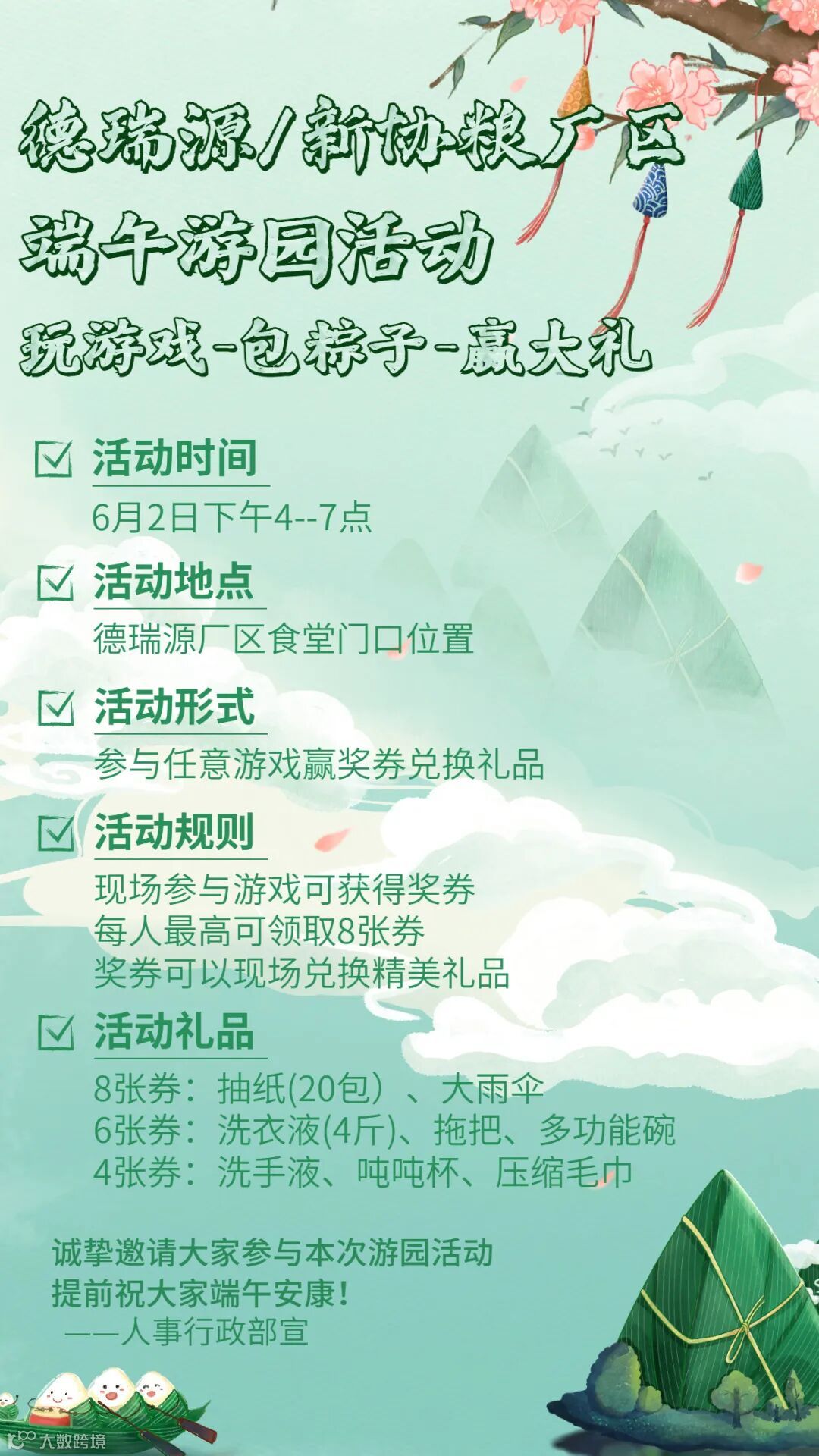 5.包粽子:现场 DIY 动手包粽子,2 个成品可找工作人员领取 1 张兑奖券。