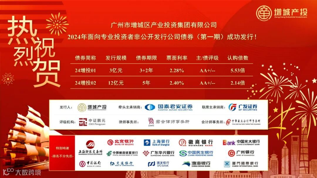 11月20日,增城产投集团2024年第一期非公开发行公司债券在上交所成功发行!本期债券发行规模15亿元,其中,3+2年期,3亿元,票面利率2.28%,全场倍数5.53倍;5年期,12亿元,票面利率2.4%,全场倍数2.14倍。本期债券有超30家金融机构竞相申购,充分彰显了资本市场对增城产投集团长期稳健经营及良好发展前景的高度认可。