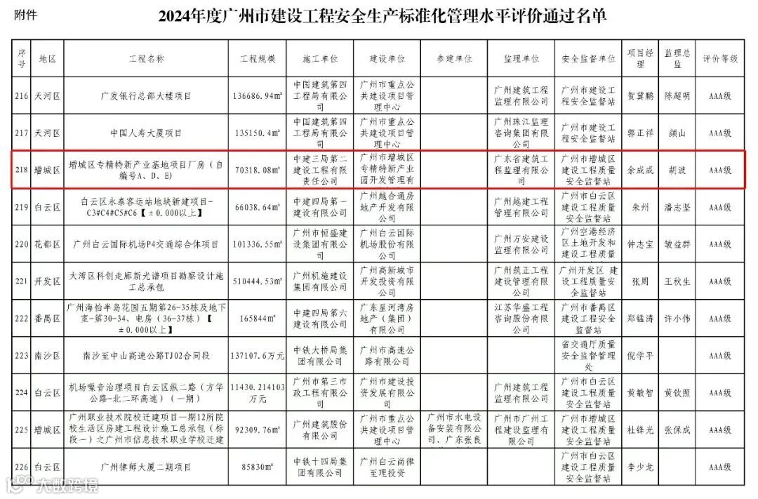 近日,由广州市建筑业联合会评定的2024年度广州市建设工程安全生产标准化管理水平评价发布,增城专精特新产业基地荣获最高评价等级AAA级,标志着其在安全生产管理方面达到了行业领先水平。1月2日,再传喜讯,增城专精特新产业基地入选广州市产业园区商会组织评选的荣誉榜单,获评为2024年度新质智造产业园,标志着园区在载体设计、为企业提供智能制造发展的实用空间上得到了业界高度认可。