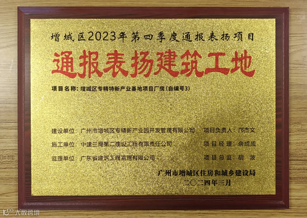 荣获增城区2023年第四季度“通报表扬建筑工地”称号