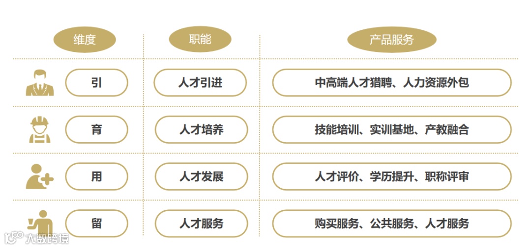 增城人才集团采用“1个母公司+n个子公司”的模式,坚持人才“引、育、用、留”全链条服务的业务发展思路,发挥一站式人才服务平台和一体化产学研用平台功能,提供包括人才识别、引进、人才培育、人才发展在内的全方位服务业务,并聚焦“芯显车”等主导产业及集成电路、人工智能、数字经济、绿色能源等战略性新兴产业需求,重点开展中高端人才猎聘、人力资源外包、技能培训、实训基地、产教融合、人才测评、人才安居相关服务等业务,畅通人才“供给侧”和产业“需求侧”,以人才“智动力”赋能区域产业快速发展和转型升级。
