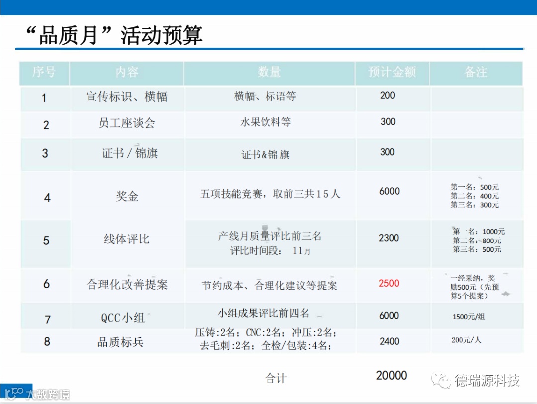 品质改善为期一个月,虽任务繁重,道阻且长,但奖励多多,有心则至;公司将会拿出2万元作为品质改善月的奖金,具体活动计划及奖励明细如下: