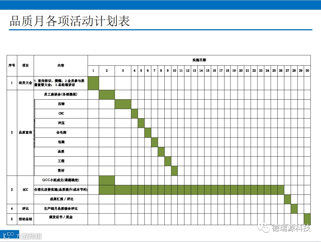 “品质改善月”由品质部主导、携手冲压、压铸、CNC、包装四大生产单位及其相关的周边单位展开为期一个月的品质改善月。