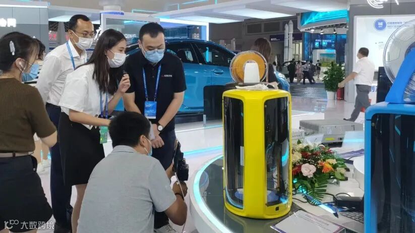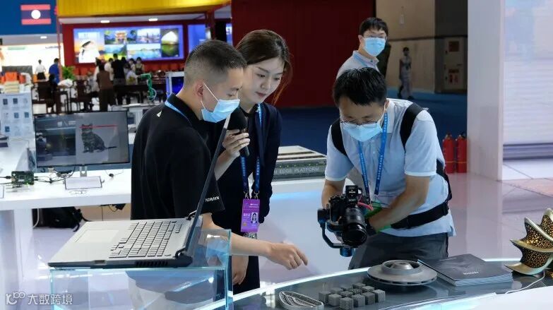 媒体记者在安德瑞源展台拍摄金属3D打印展品,并采访了工作人员。