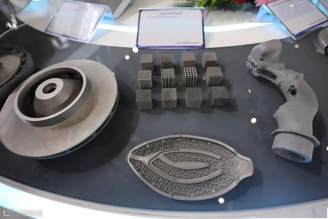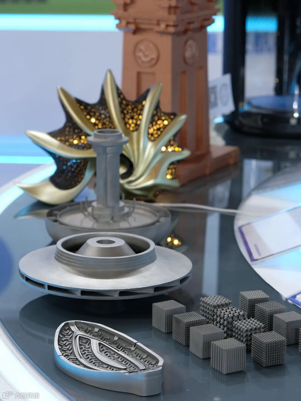△(左)叶轮盘;(中上)金属3D打印晶格;(中下)金属鞋模:(右一)尼龙件