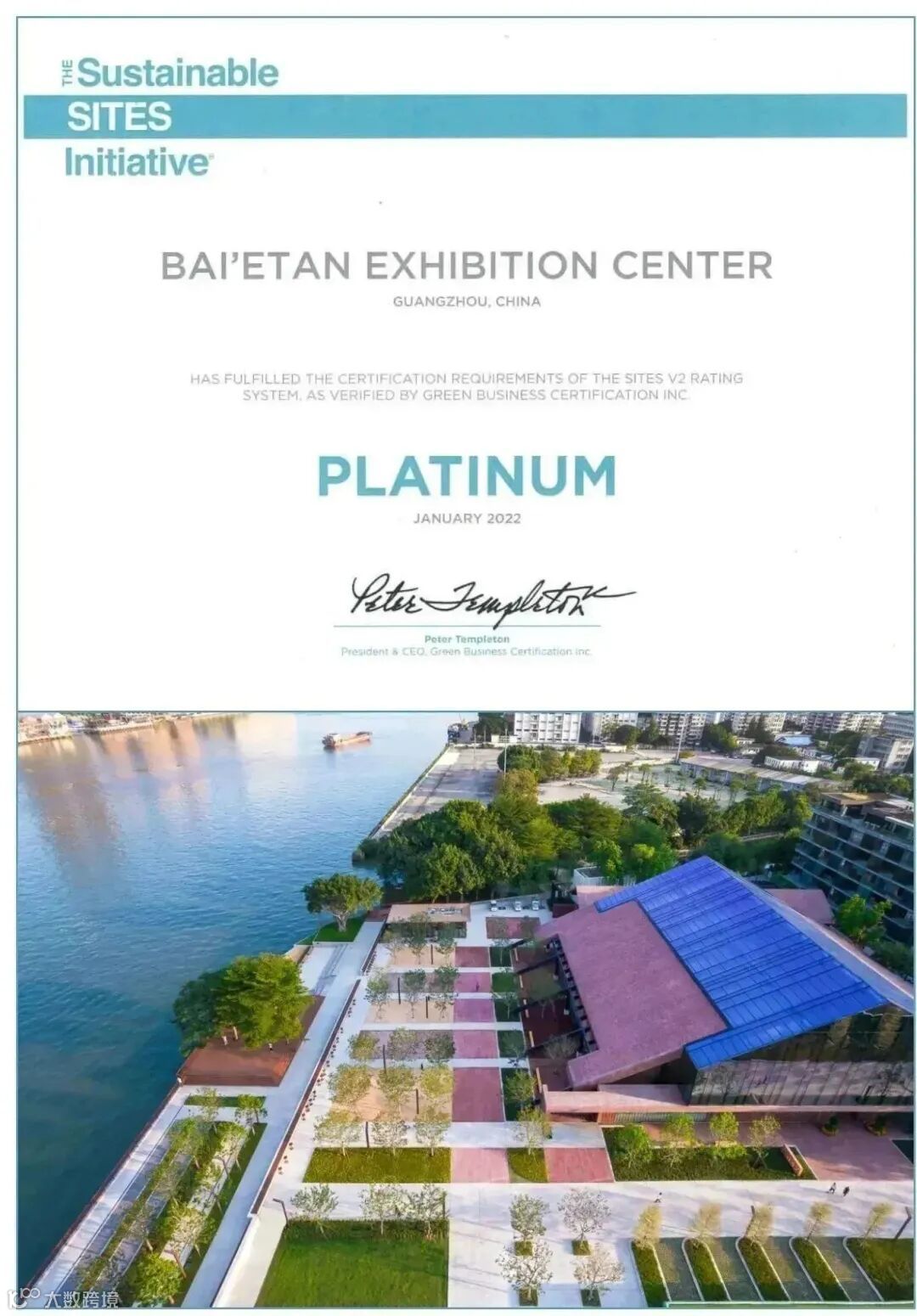 2022年1月,聚龙湾项目荣获国际绿色事业认证协会(GBCI)颁发的SITES(可持续性场地评价体系)最高级别认证——铂金奖,这是SITES官方评估认证的中国首个铂金级项目。