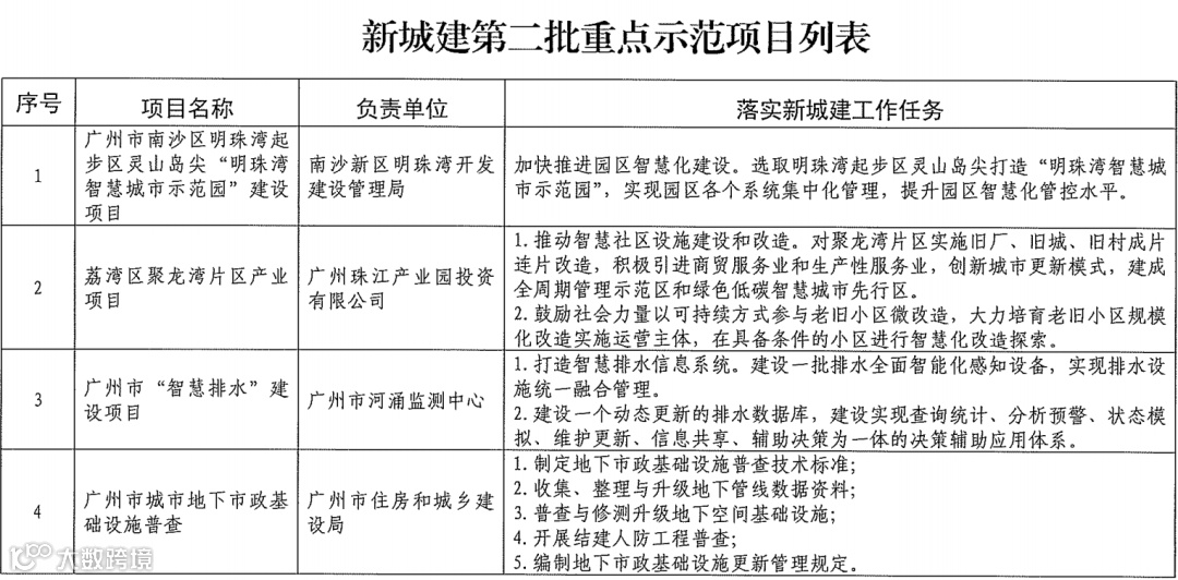 2020年8月,住房和城乡建设部会同六部委印发的《关于加快推进新型城市基础设施建设的指导意见》中首次提出“新城建”概念,即对城市基础设施进行数字化、网络化、智能化建设和更新改造。广州市成为全国首批创建“新城建”产业与应用示范基地城市之一,2020 年 12 月率先印发实施《关于加快推进广州市新型城市基础设施建设的实施方案》,坚持将“新城建”产业与应用示范基地创建与“新城建”试点工作统筹推进。