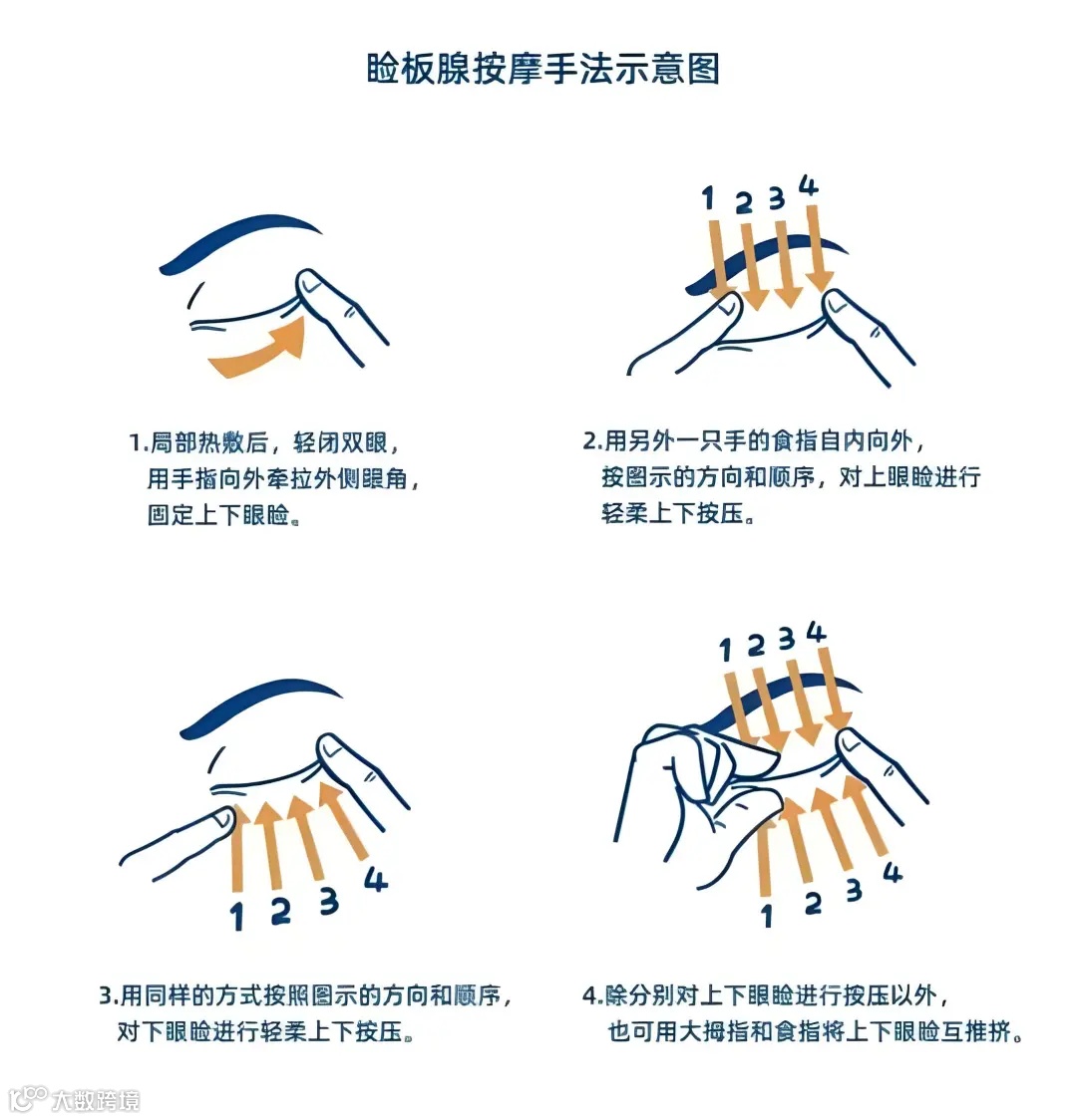 3.眼睑按摩:特别是对于睑板腺功能障碍的患者,从睑缘处垂直轻轻按摩可以促进油脂分泌,更好地缓解症状。