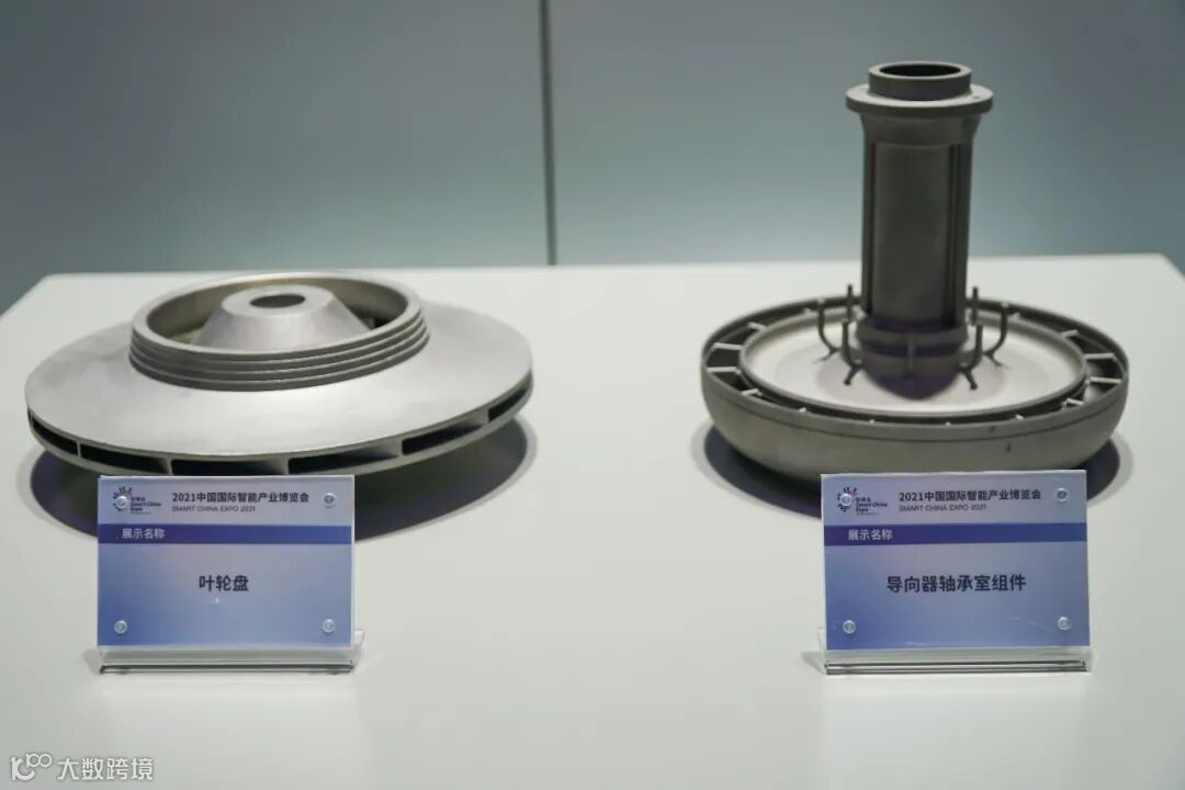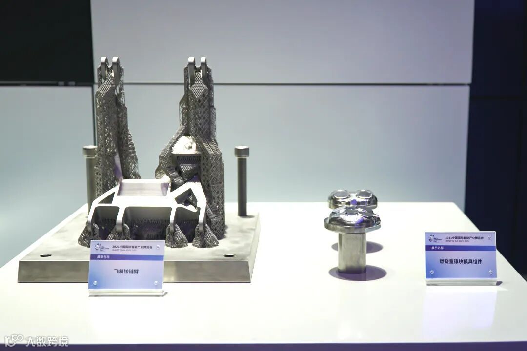 内燃机燃烧室镶块模具、导向器轴承室组件、飞机铰链臂等展品、叶轮盘、鞋模组件。