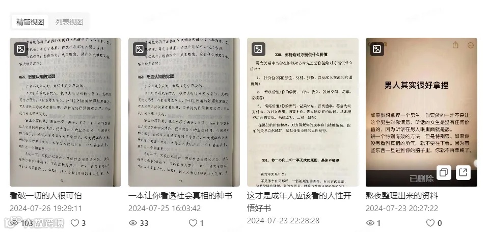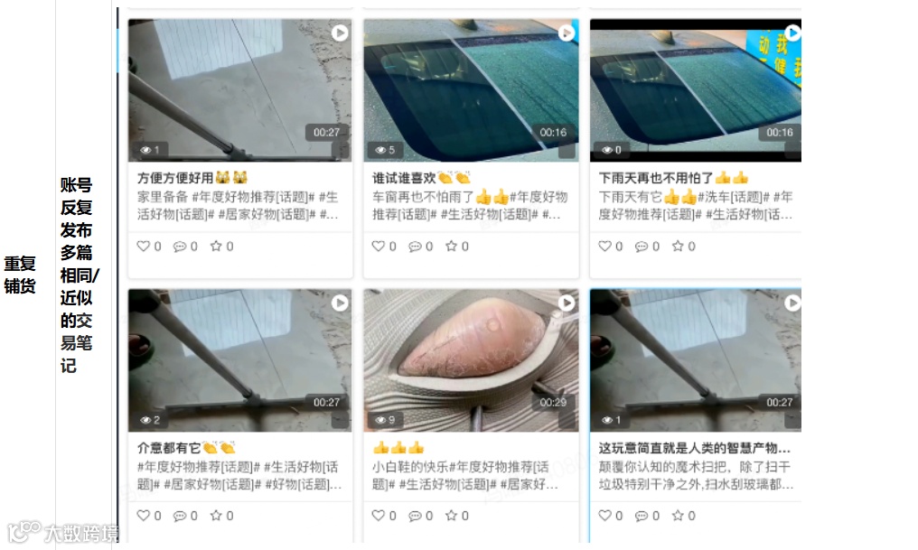 1.重复铺货:指封面、视频内容、笔记标题高度相似或雷同的笔记。这类笔记不仅缺乏新意,还可能因内容重复被平台认为是“灌水”行为,进而影响账号整体权重。