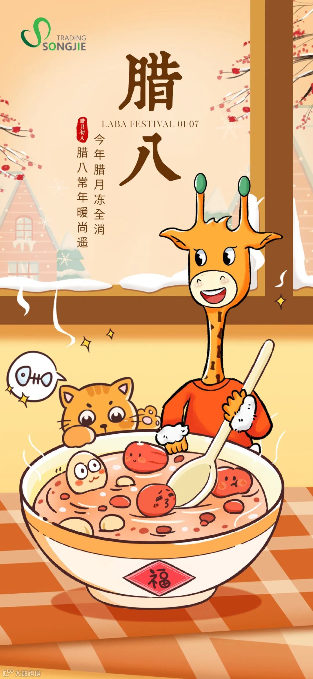 腊八一碗粥,幸福好兆头!🎉今年腊月冻全消,腊八暖心更暖胃!🦒萌萌长颈鹿颂颂带你开启一整年的好运,从喝下第一口腊八粥开始!🍲红枣甜甜,寓意心想事成;莲子圆圆,愿你团团圆圆;再来一颗花生,步步“生花”,财运不断~🐱✨