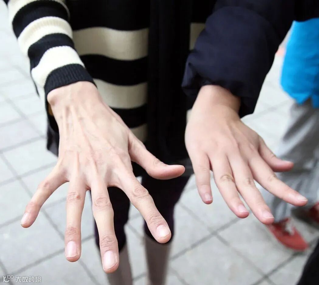 首先,我们可以观察手的比例。如果你是左侧马凡综合症患者,那么你的左右手的比例可能会有所不同。正常人的左右手比例是对称的。下图右侧是正常人的手。