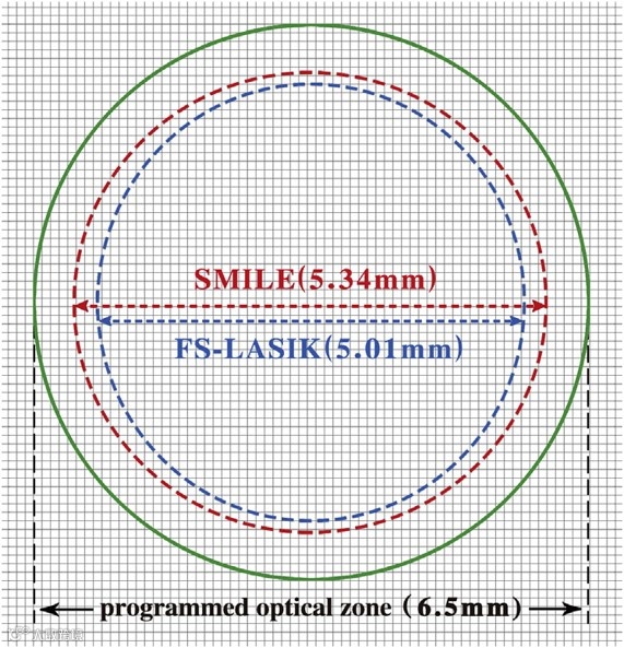 ▲输机6.5 mm设计光学区术后,微创SMILE有效光学区比FS-LASIK更大0.3 mm。