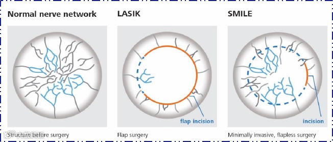 ▲国际权威干眼协会TFOS的综述图示,微创无瓣的SMILE手术(右),较大切口制瓣类型手术(中),术后角膜神经纤维密度更高。